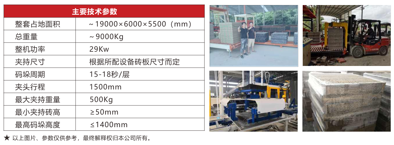 整套系統(tǒng)采用PLC+觸摸屏控制,配合智能傳感器,實(shí)現(xiàn)無(wú)人自動(dòng)化運(yùn)行,出現(xiàn)故障自動(dòng)停機(jī)報(bào)警并顯示故障位 置,無(wú)需專業(yè)技術(shù)人員就可輕松排除故障,設(shè)備運(yùn)行采用電、氣、液分別控制,互不干擾、動(dòng)作連貫,約16s左右可碼 一層,班碼磚量約2000板,配套叉車抱夾可實(shí)現(xiàn)無(wú)托盤轉(zhuǎn)運(yùn),裝車。